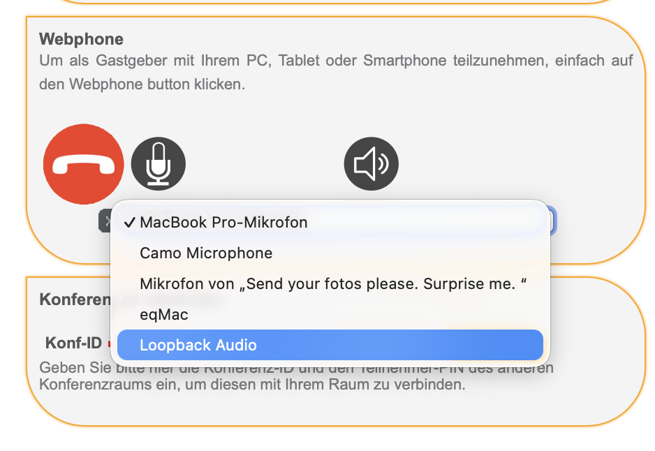 - Im WebPhone das virtuelle Audiogerät als Mikrofon auswählen